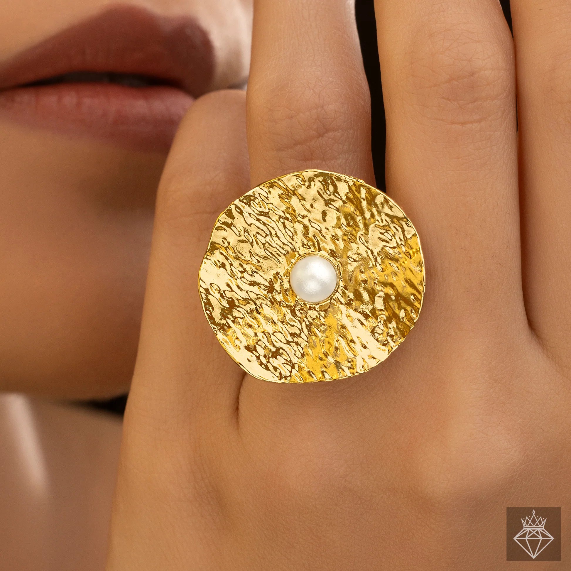 Elevate your style with this exquisite hammered pearl ring by AUROZI, where raw texture meets refined beauty. The handcrafted hammered coin design reflects light with subtle shimmer, while a single luminous pearl sits gracefully at its center — striking the perfect balance between bold artistry and classic sophistication.