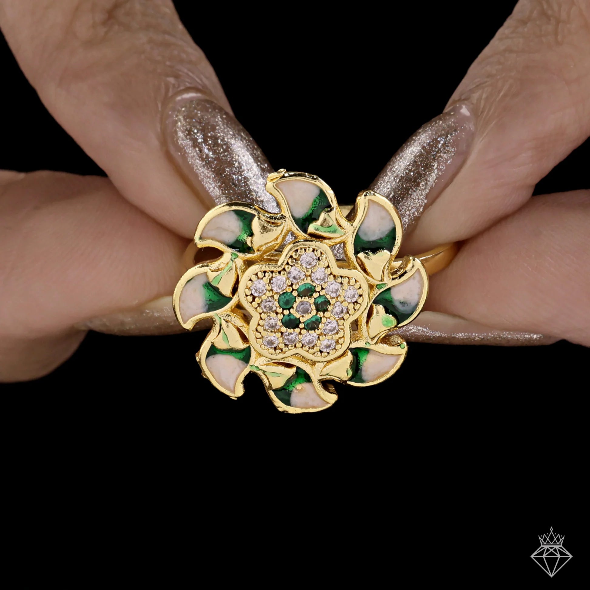 The AUROZI Golden Flower Ring adds a touch of elegance and romance to your everyday or occasion look. Designed in a graceful floral silhouette, this ring showcases vivid enamel detailing and sparkling American Diamonds (ADs) that catch the light with every gesture. The intricate craftsmanship highlights each petal with depth and brilliance, blending traditional charm with modern appeal. Finished with an anti-tarnish coating and an adjustable band, this piece offers lasting beauty and a snug, comfortable fit. Whether worn solo or styled with other rings, it brings refined sophistication to any outfit.