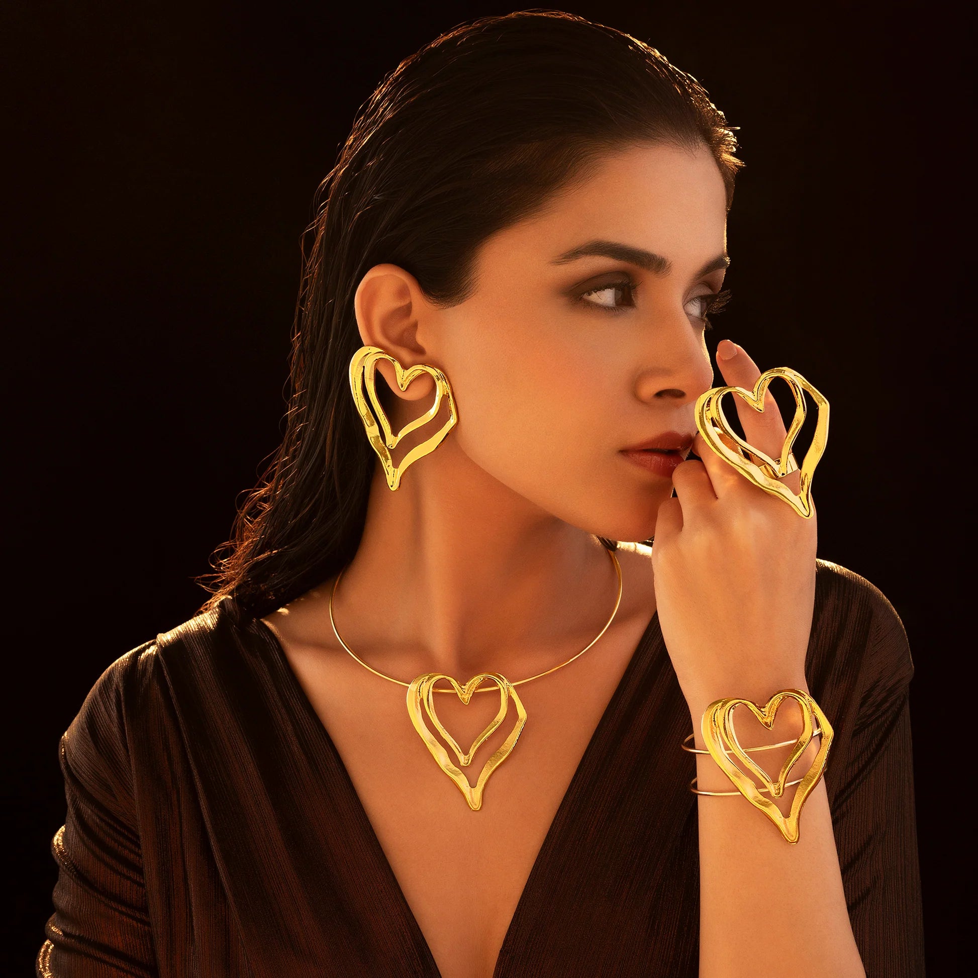 Celebrate love and elegance with this beautifully crafted heart-motif jewelry set. Designed to capture the warmth of romance with a modern flair, the set includes a stunning necklace, charming earrings, a stylish bracelet, and a perfectly paired ring — each piece thoughtfully created to complement one another.