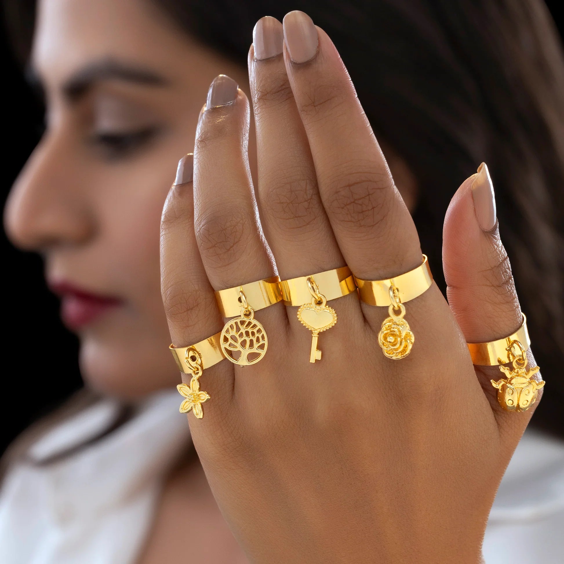 Super Saver Pack Of 5 Anti-Tarnish Premium Quality Gold Plated Charms Rings By AUROZI (Adjustable Size)