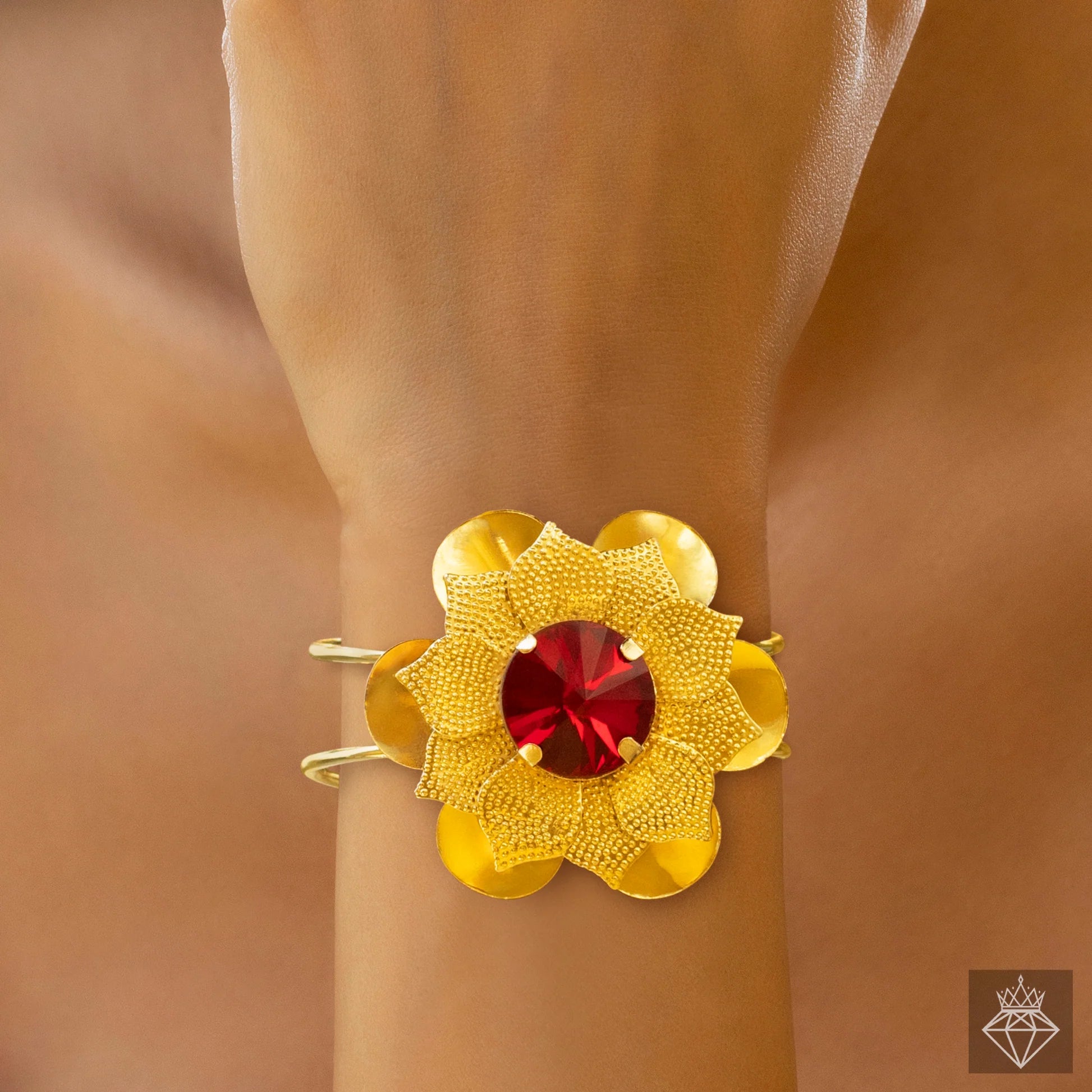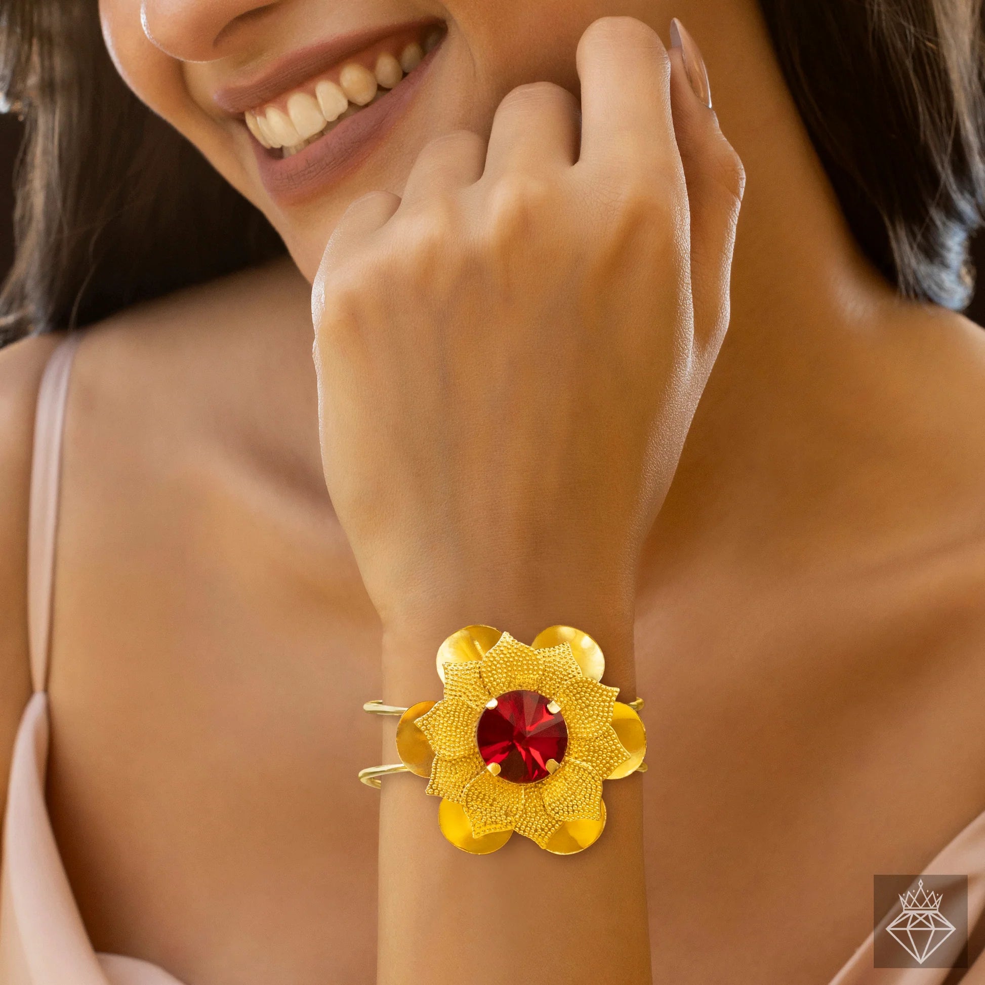 Add a burst of charm to your ensemble with the AUROZI Red Crystal Floral Bracelet. This elegant piece features intricately designed blossoms highlighted by vivid red crystals, offering a striking contrast and a dose of radiant color.